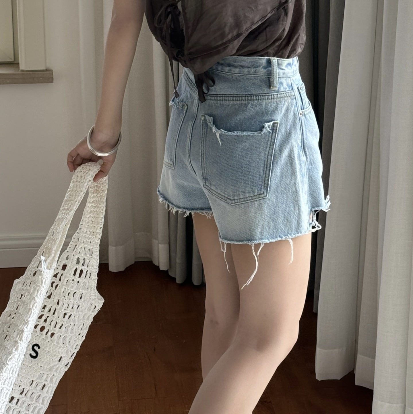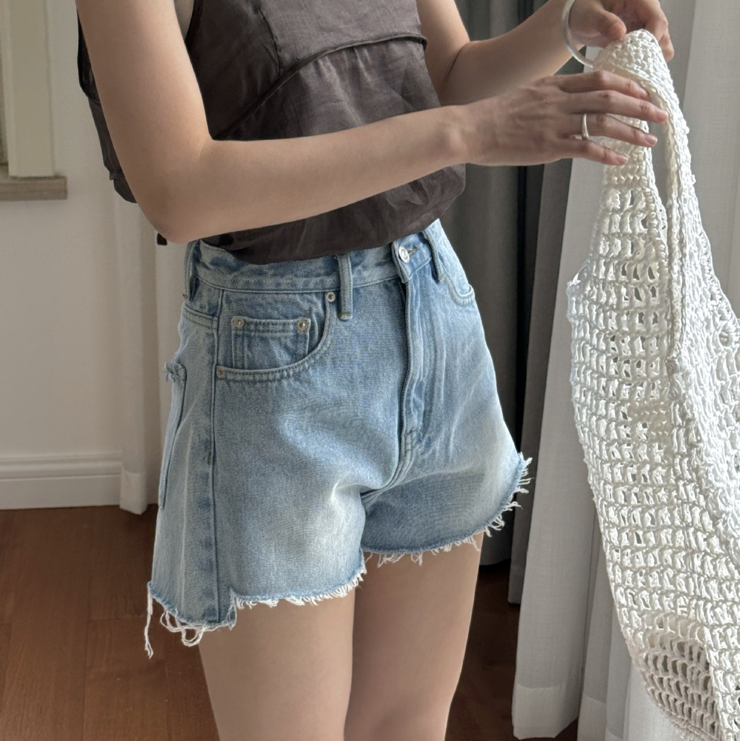 フリンジカット加工のおしゃれミニ丈デニムパンツ