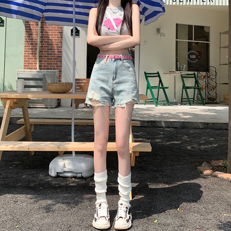 ハイウエストベルト付きミニ丈デニムパンツ