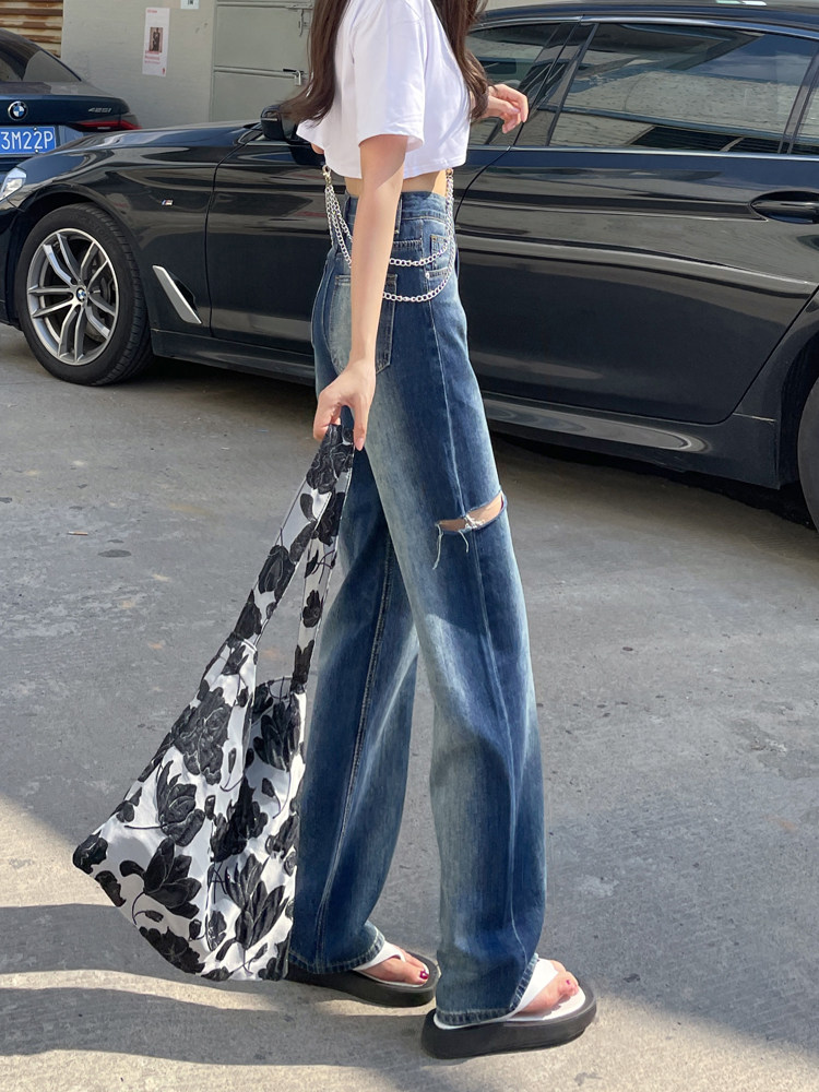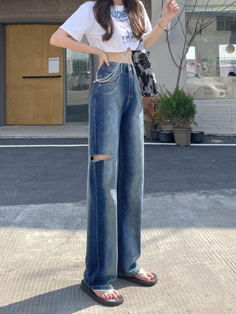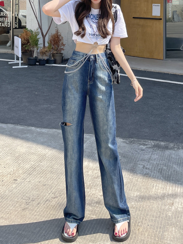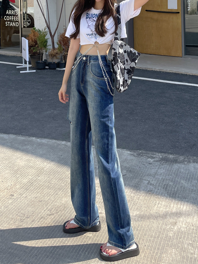 膝部分にこなれたダメージ加工を施したレディース ジーンズです。 ゆったりとしたワイドストレートシルエットで脚のラインを拾わず、リラックス感のある着こなしが楽しめます。 ウエスト部分にあしらわれたチェーンアクセサリーが個性的なアクセントになり、シンプルなトップスとも相性抜群です。 ヴィンテージ風の色落ち加工とダメージ部分が絶妙なバランスで、カジュアルながらもトレンド感のある一本に仕上がっています。