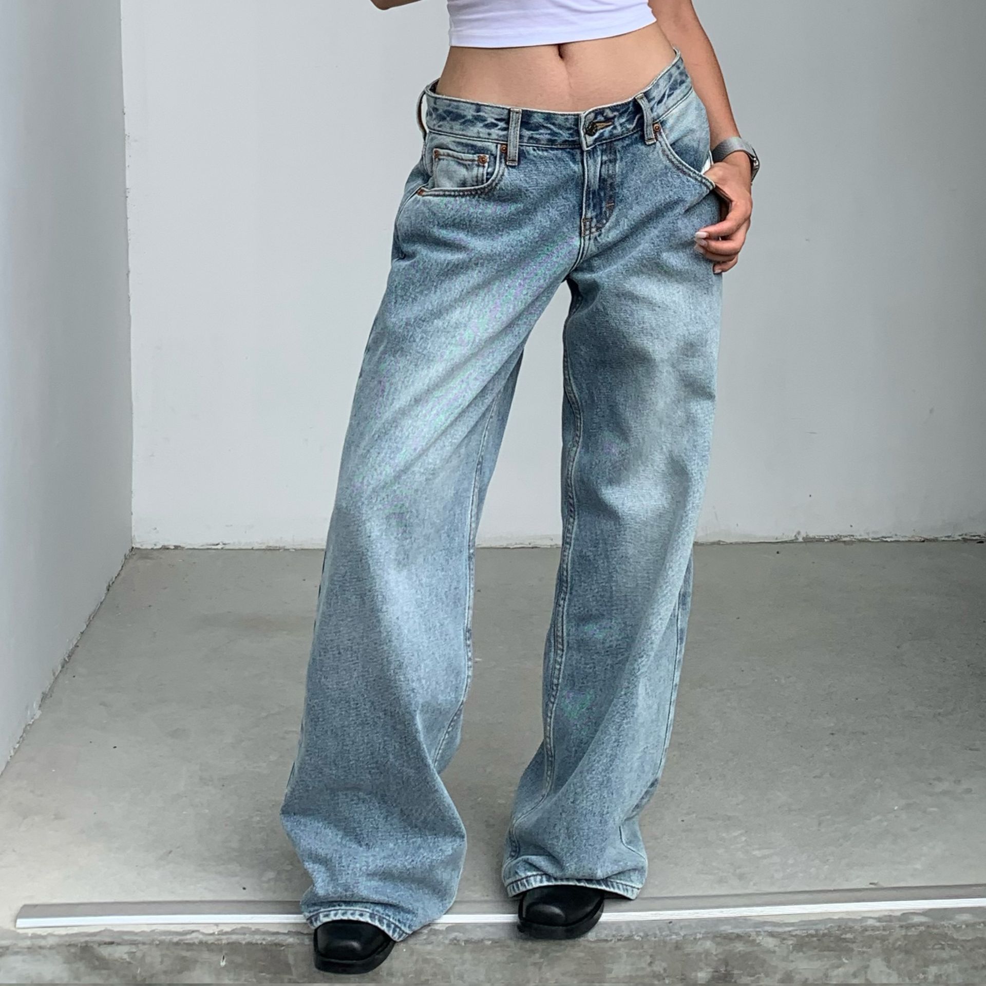 脚のラインを美しくカバーするワイドなシルエットが魅力のレディース ジーンズです。