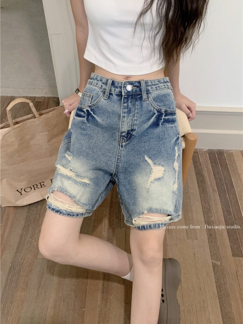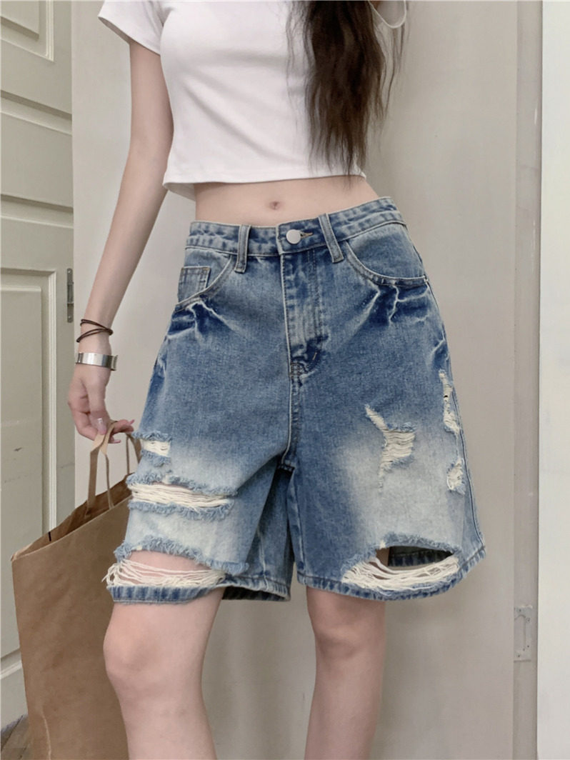 トレンド感溢れるダメージ加工が魅力的なレディース ジーンズのハーフパンツです。 膝上丈のゆったりとしたシルエットで、リラックス感のある着こなしが楽しめます。 ダメージ加工とほつれ加工がカジュアルな雰囲気を演出し、こなれた印象に仕上がります。 ハイウエストデザインでスタイルアップ効果も期待でき、様々なトップスと相性抜群です。 夏のカジュアルコーディネートに最適なアイテムです。
