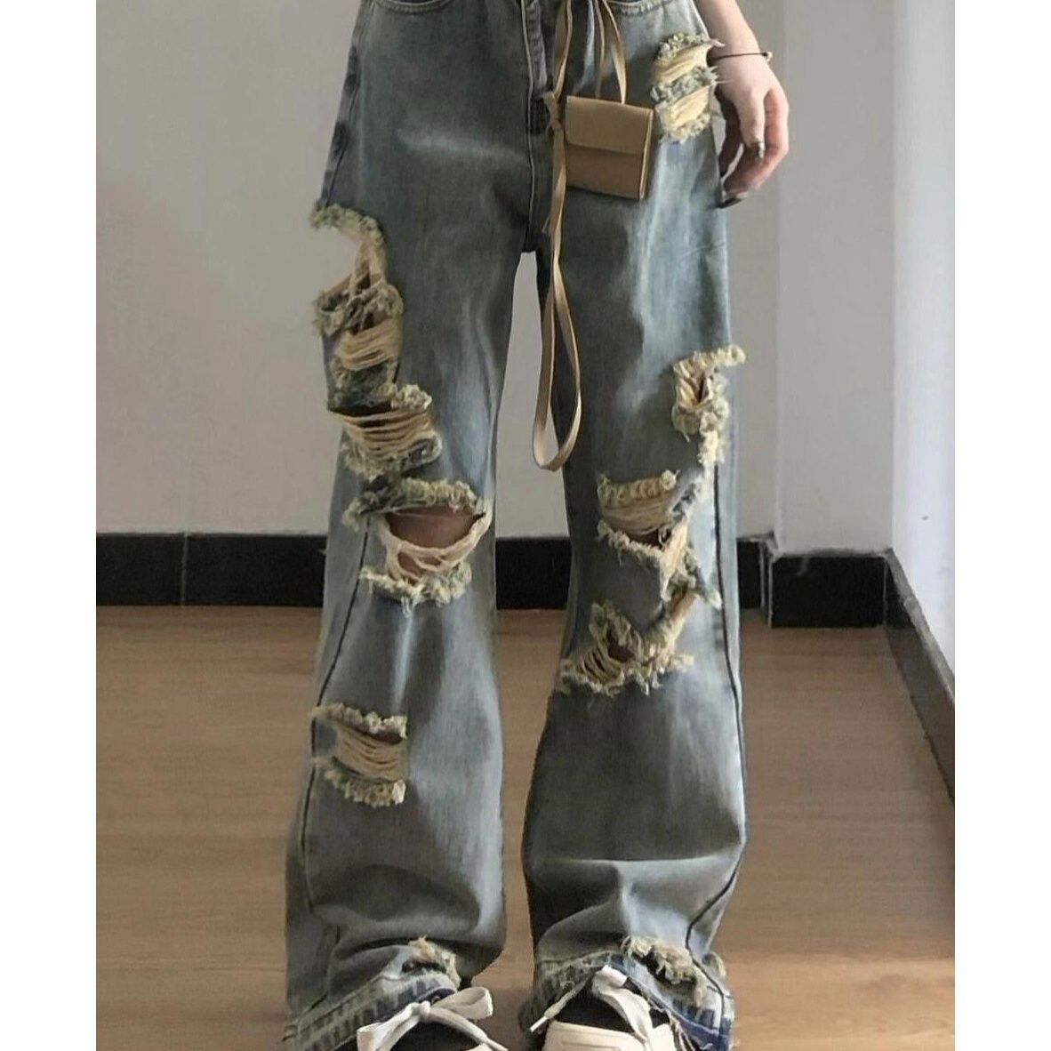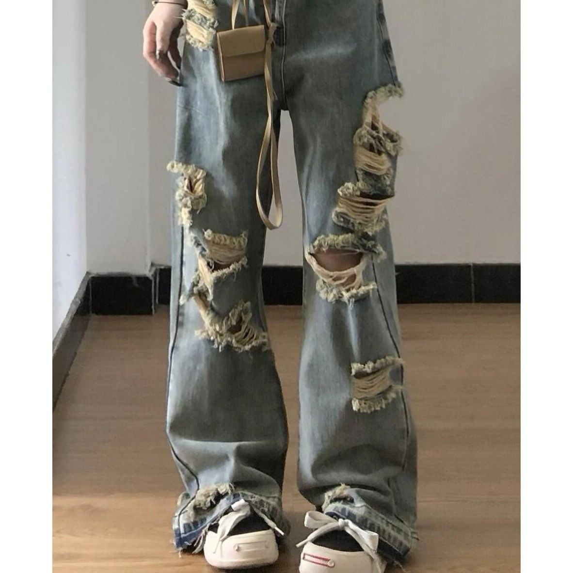 膝から裾にかけて大胆なダメージ加工を施し、ヴィンテージ感溢れる仕上がりになっています。