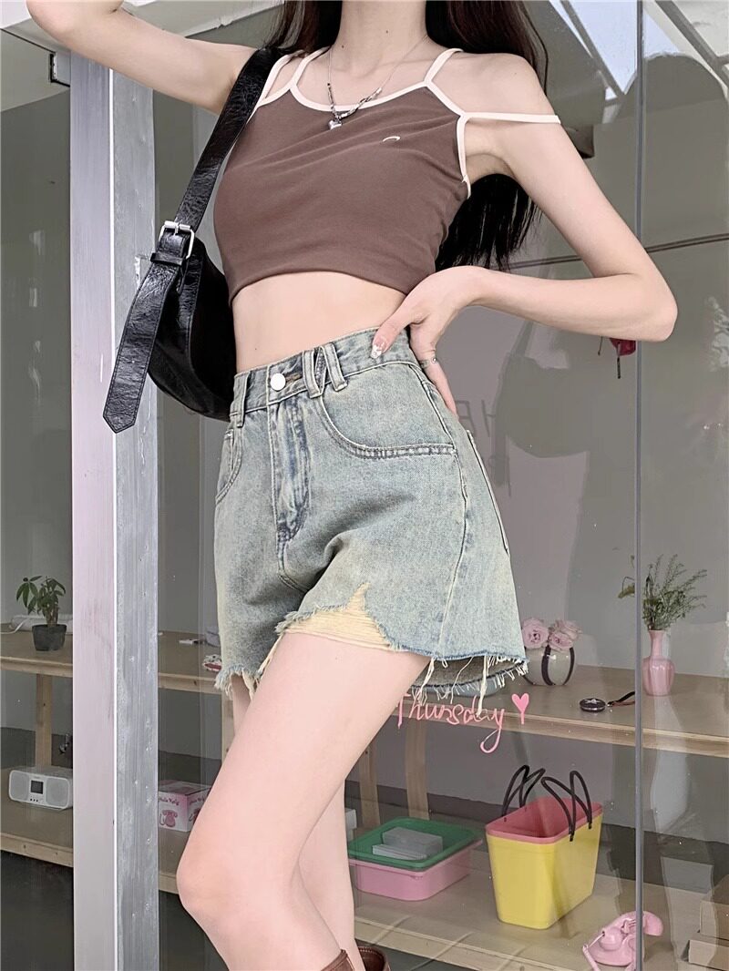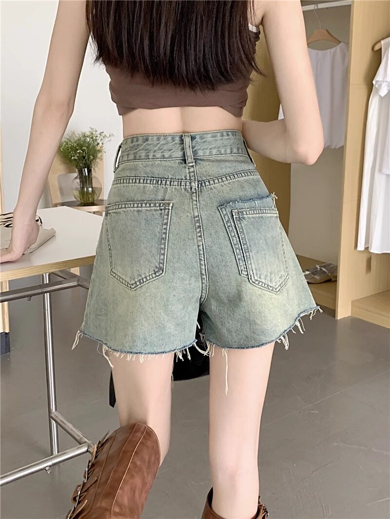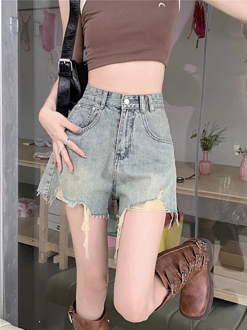 こなれ感たっぷりのレディース ジーンズのショートパンツです。 ハイウエストデザインで脚長効果抜群、スタイルアップが叶います。 裾のアシンメトリーなダメージ加工とフリンジが個性的なアクセントになり、ヴィンテージ風の色落ち加工が程よい抜け感を演出します。 カジュアルからストリートまで幅広く着回せる万能アイテムで、夏のおしゃれに欠かせない一枚です。